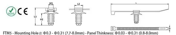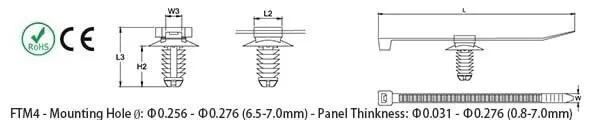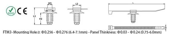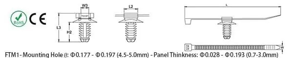 | 黑色 ▼ | 長度 mm(in.) ▼ | 寬度 mm(in.) ▼ | 最大束徑 mm ▼ | 最小拉力 kg(Lbs) ▼ | 固定座 DiscΦ Ø mm (in.) ▼ | 固定座 長度 (L2) mm (in.) ▼ | 固定座長度 (L3) mm (in.) ▼ | 固定座寬度 (W3) mm (in.) ▼ | 固定座高度 (H2) mm (in.) ▼ |
